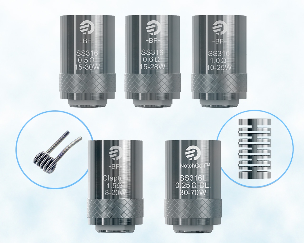 - 0.5 BF-SS316, 20-30w, lung inhale. AIO compatible.